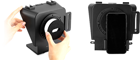 Суфлер позволяет снимать на мобильный телефон как горизонтально, так и вертикально с помощью держателя телефона, который крепится к корпусу суфлера. Ширина держателя 56–90 мм. Держателей в комплекте 3 шт и к ним имеются крепления в количестве 3 шт